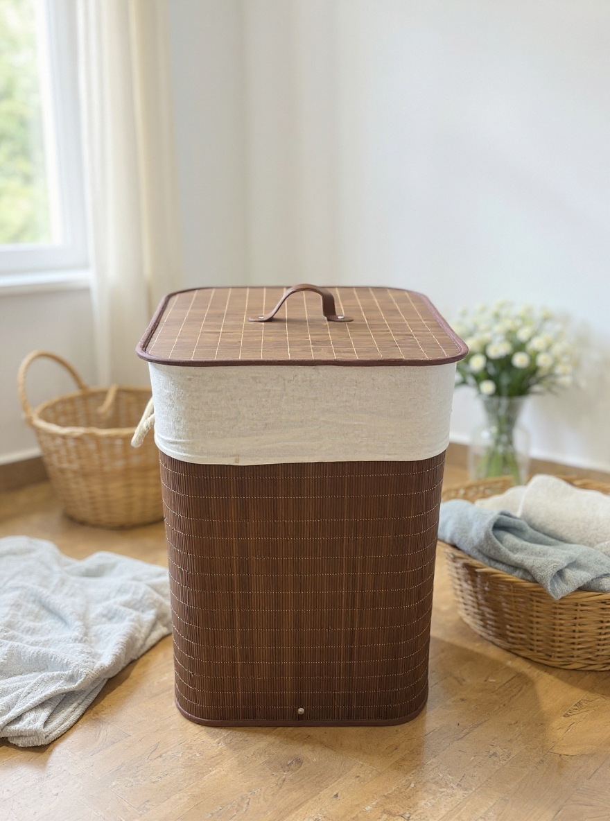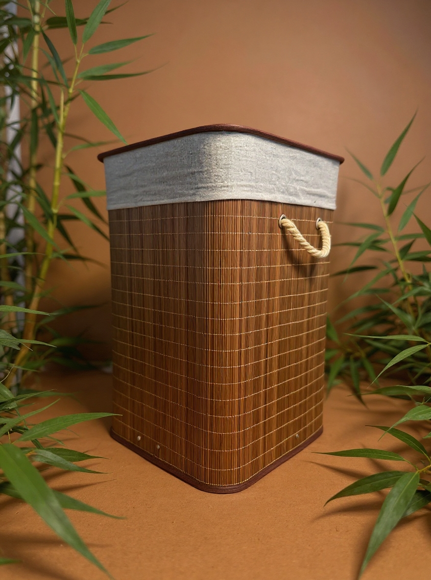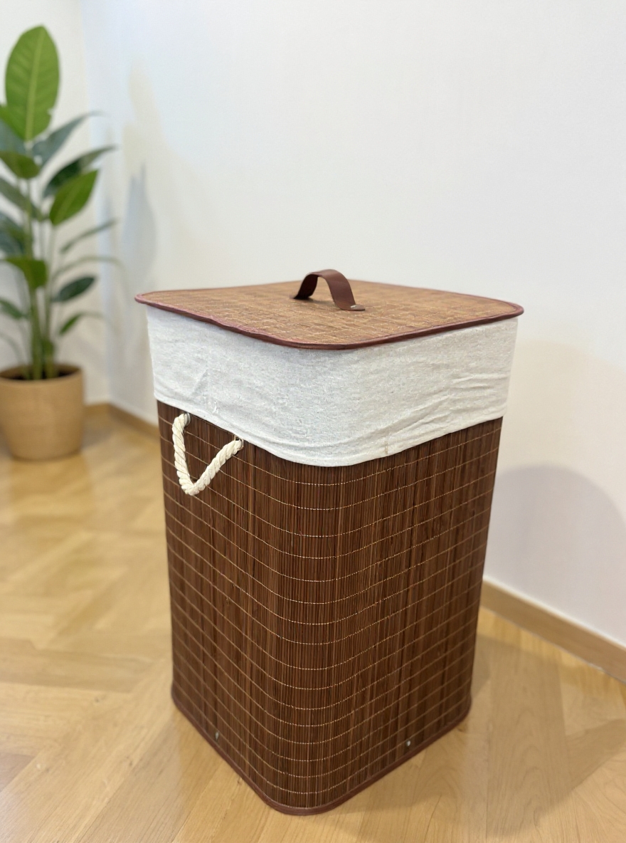 ყავისფერი ბამბუკის კალათა სათავსო ტანსაცმლის, სარეცხის, სათამაშოების და სხვა საოჯახო აქსესუარების მოსათავსებლად. მოცულობა: 70 ლიტრი.