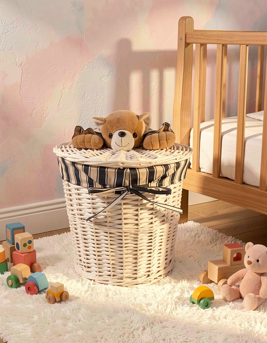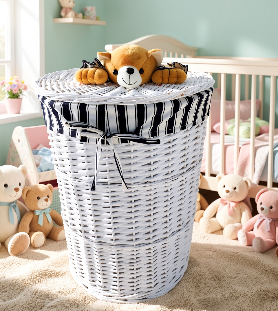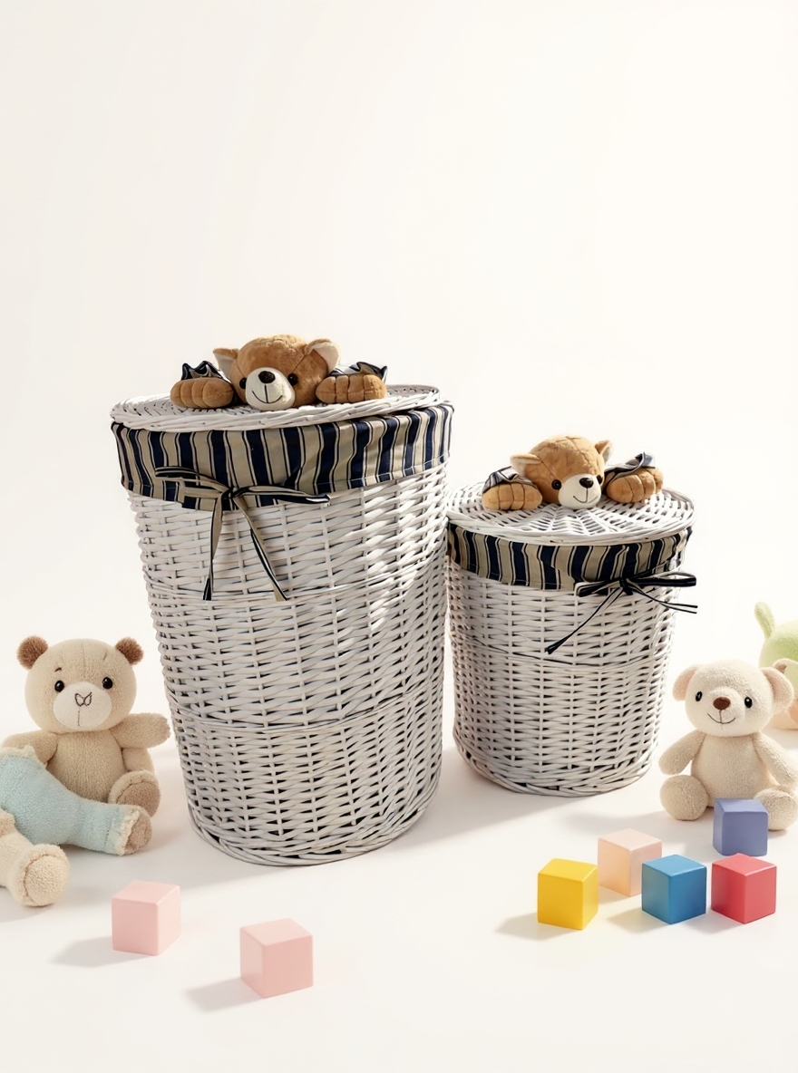 თეთრი ხის დათუნია სათავსოების ორცალიანი ნაკრები სათამაშოების, სარეცხის და სხვა აქსესუარების მოსათავსებლად. ზომები: დიდი – 57/44 სმ, პატარა: 39/37 სმ.