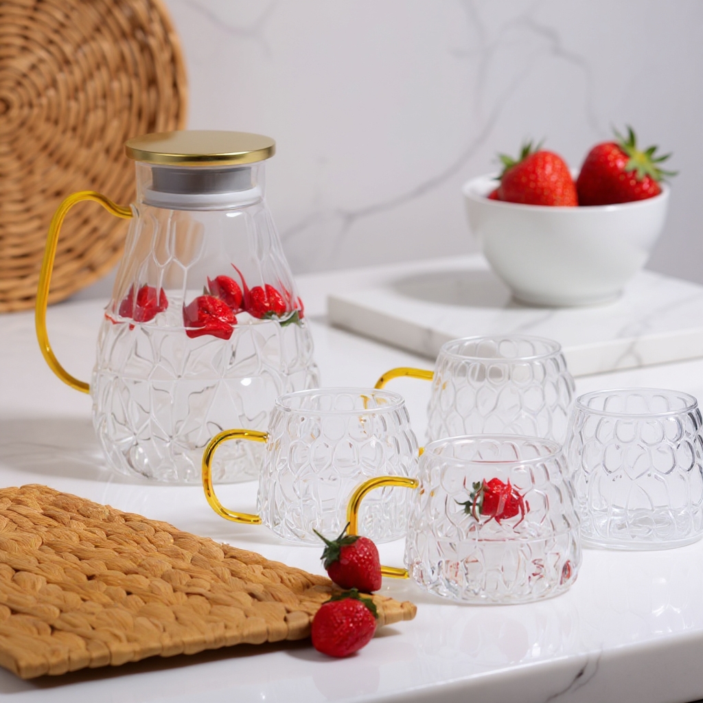 მინის გრაფინის და ჭიქების ნაკრები ოქროსფერი სახელურებით გამაგრილებელი სასმელებისთვის.