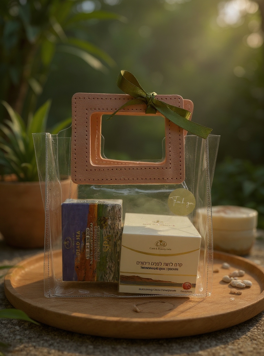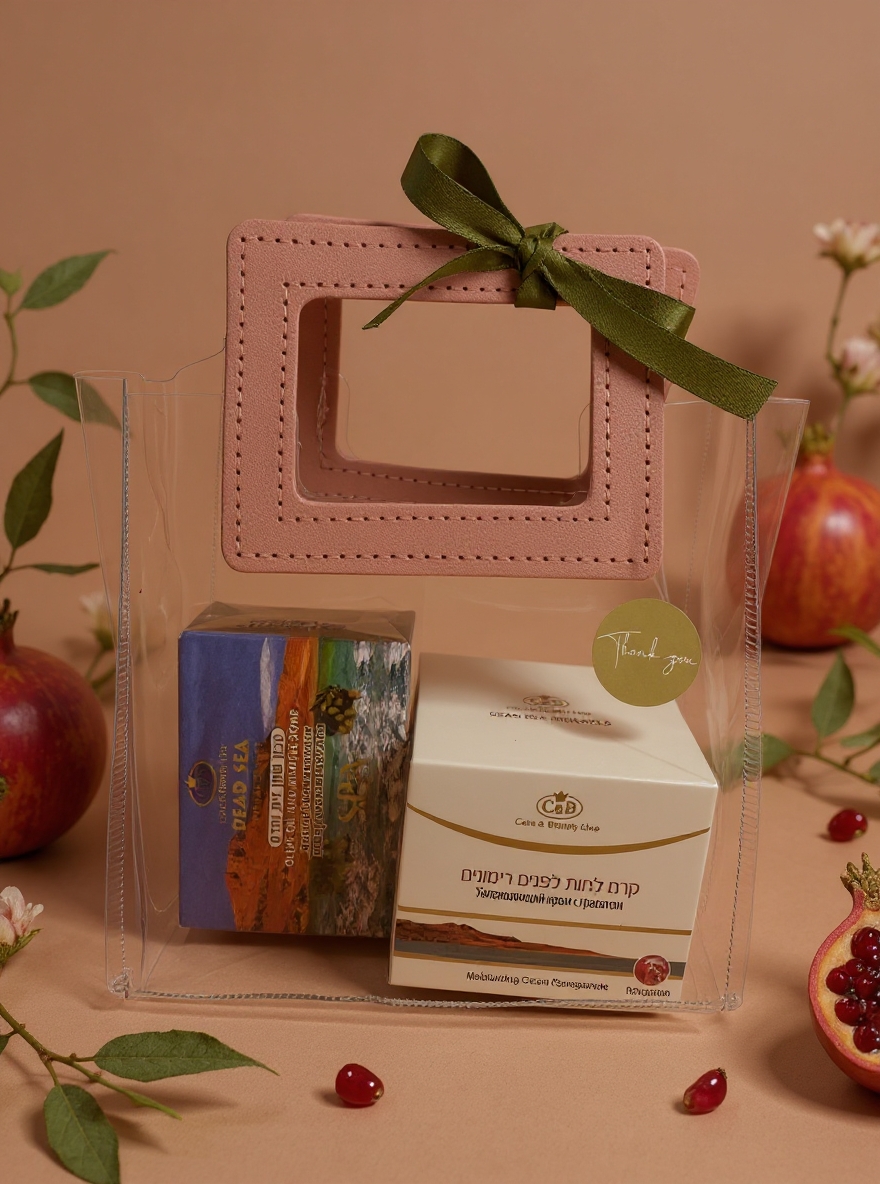 მკვდარი ზღვის კოსმეტიკის ნაკრები. სასაჩუქრე შეფუთვა. ნაკრები მოიცავს მკვდარი ზღვის მინერალებზე დამზადებულ მკვებავ კრემს ბროწეულის ექსტრაქტით (50 მლ)და ასევე მკვდარი ზღვის მინერალებზე დამზადებულ საპონს (120 გრ) ზეთისხილის და მირტის ექსტრაქტით.